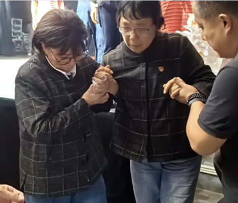 演出完毕,李红梅(左)搀扶着桂梅老师(中)走下舞台