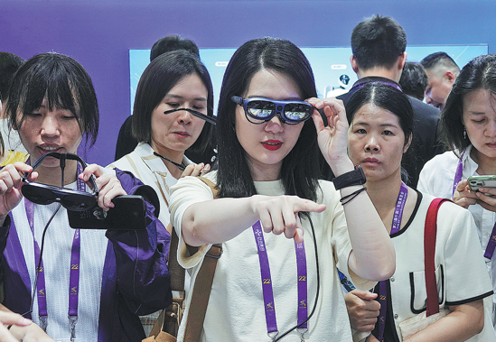 Visitors put on Rokid smart glasses during the China-ASEAN Expo in Nanning, Guangxi Zhuang autonomous region, on Sept 18. YU XIANGQUAN/FOR CHINA DAILY