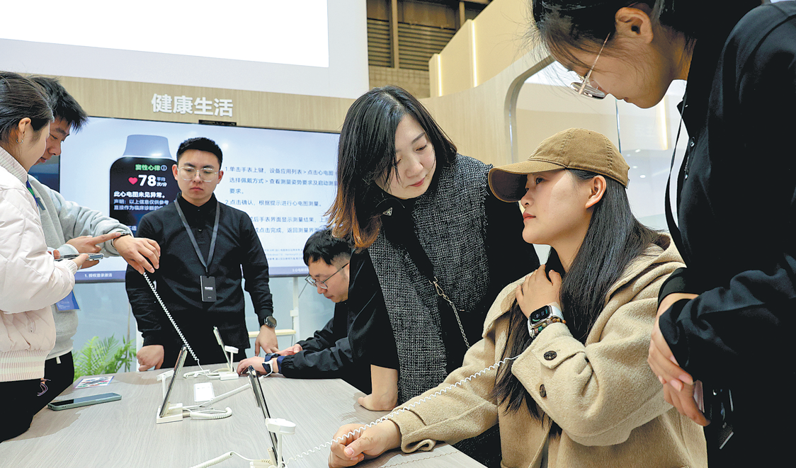 Visitors try smart watches that actively monitor blood pressure at the Appliance &Electronics World Expo in Shanghai on March 20, 2025. FANG ZHE/XINHUA