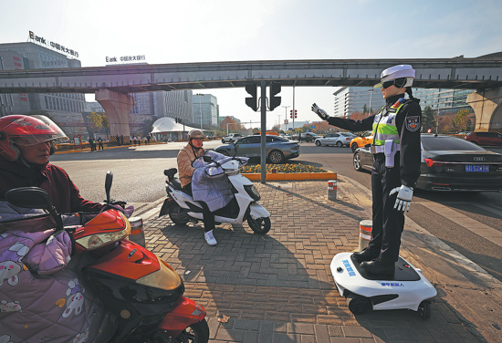 A robot officer with a badge that reads "Intelligent Police Unit R001" is seen on a road in Wuhu, Anhui province, on Jan 10. WANG YUSHI/FOR CHINA DAILY